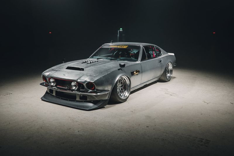 Chiếc Aston Martin V8 Vantage cổ đã được làm mới toàn bộ thân xe, hoàn thiện trong màu sơn bạc tuyệt đẹp. Điểm nhấn chính là hốc gió trung tâm trên mui xe, thiết kế hầm hố ở cả mặt tiền và đuôi, bộ mâm cổ điển cũng được sơn bạc và ống xả đặt bên hông.