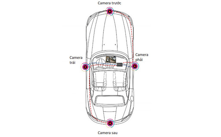 4 mắt camera được lắp đặt phân bố đều trên xe : 1 camera trước, 1 camera sau và 2 comera 2 bên gương trái, phải) , bộ điều khiển trung tâm.