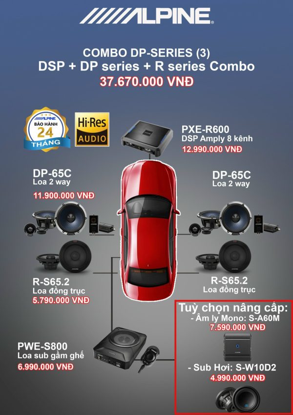 Combo Độ Loa Alpine DP-Series là combo độ loa cơ bản, giá thành hợp lý.Bao gồm các thành phần loa cánh là Loa 2 Way(DP-65C),Loa đồng trục R-S65.2 -PXE(DSP Amly 8 kênh) và Sub gầm ghế quốc dân nhỏ gọn PWE-S800.