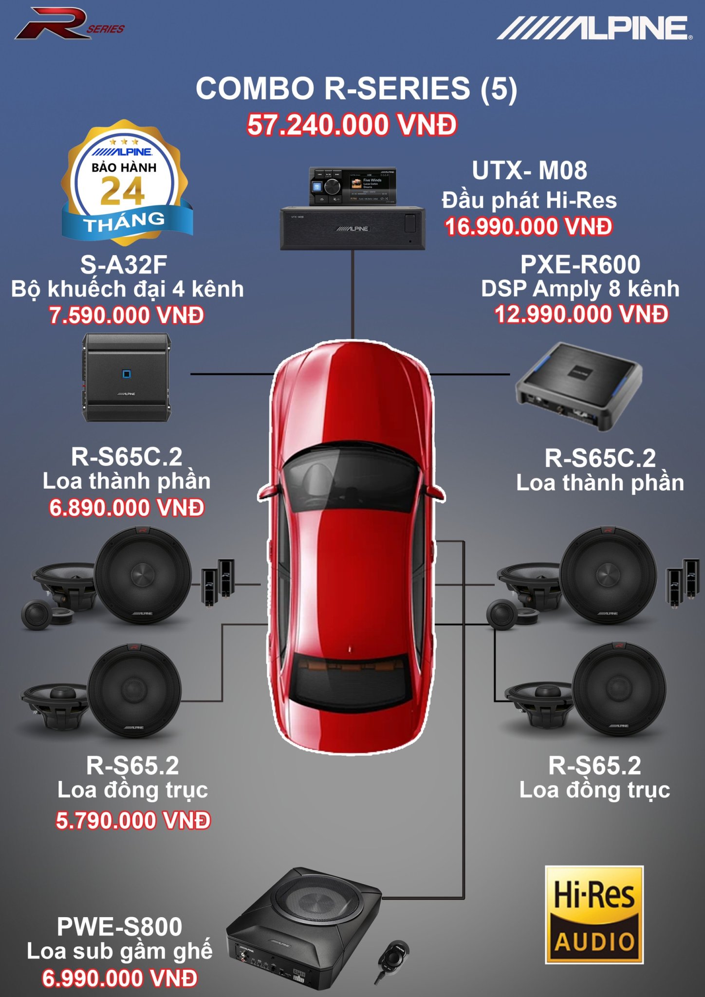 Combo Độ Loa Alpine R-Series là combo độ loa gói cao cấp. Bao gồm các thành phần loa cánh Alpine R-S65C.2 – Bộ S-A32F khuếch đại 4 kênh và loa Sub gầm ghế quốc dân PWE-S800.Kèm theo đó là Đầu phát UTX-M08 và Bộ PXE(DSP Amly 8 kênh)