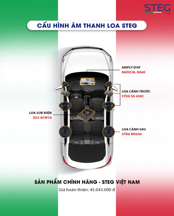 Combo Độ Loa Cấu Hình STEG là combo độ loa cơ bản, giá cả hợp lý. Bao gồm các Loa cánh STEG SG 650C+ Loa STEG MS650, Amly RADICAL RA6ll và Sub điện ACW10.