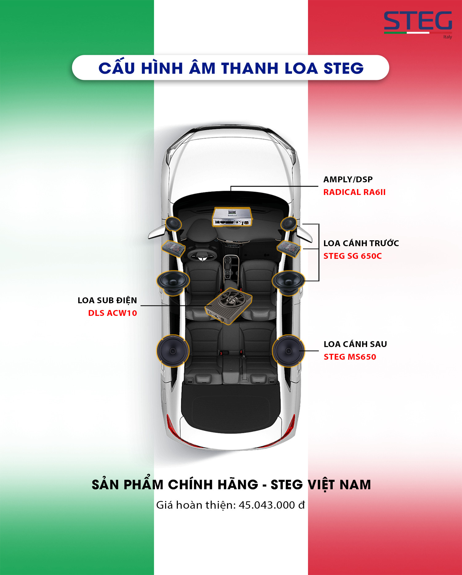 - STEG là thương hiệu âm thanh hi-end của Italia, vừa đoạt nhiều giải thưởng tại cuộc thi Âm Thanh Xe Hơi EMMA 2020 Thái Lan – thủ phủ của ngành ô tô Đông Nam Á. Các dòng loa STEG nổi tiếng với chất âm Châu Âu, âm bass xuống sâu, âm mid mượt mà, âm trebles tách bách, mở nhạc lên là đi vào lòng người.