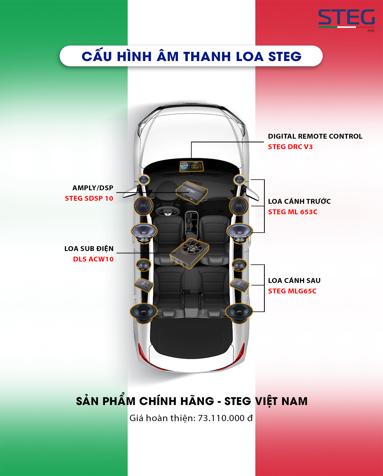 Combo Độ Loa STEG là combo độ theo cấu hình cơ bản của STEG, giá cả hợp lý.Bao gồm các thành phần loa cánh trước sử dụng STEG ML 653C, Loa cánh sau sử dụng STEG MLG65C, Kèm theo đó là Sub điện DLS ACW10,Amly STEG SDSP10 và Bộ điều khiển STEG DRC3.