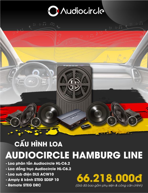 Combo Độ Loa STEG AUDIOCIRCLE HAMBURG LINE là combo độ loa được nâng cấp từ combo cơ bản của STEG. Bao gồm Loa phân tần Audiocircle HL-C6.2 + Loa đồng trục Audiocircle HL-C6.2+Sub điện DLS ACW10,Amly 8 kênh STEG SDSP10, Remote STEG DRC.
