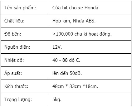 Cửa hít ô tô có thiết kế đạt chuẩn quốc tế, hoạt động với dòng điện 12V, trong điều kiện nhiệt độ khắc nghiệt. Nên khi nguồn điện xe gặp sự cố vẫn đảm bảo đóng, mở cửa như bình thường.