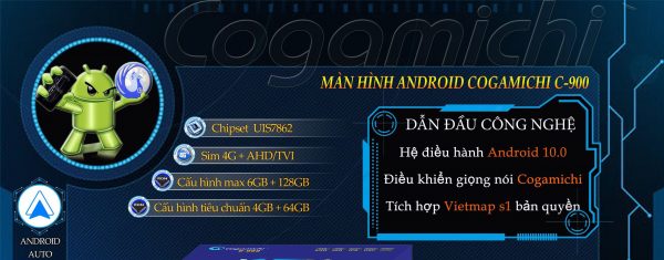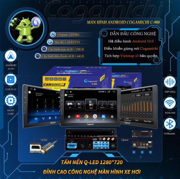 - Màn hình Android cao cấp Cogamichi C-900 New Q – LED được trang bị cấu hình cao với chipset UIS7862 với bộ nhớ truy cập ngẫu nhiên (RAM) 6GB và bộ nhớ trong (ROM) là 128GB cho phép lưu trữ kho âm thanh, hình ảnh siêu lớn.